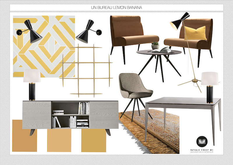 Cette fiche tendance présente un bureau de style contemporain. La couleur dominante est le jaune or pour un bureau vitaminé et lumineux. Discutons ensemble de votre projet et nous nous occupons de tout : Etablir une planche tendance pour mieux vous projeter, Acheter des meubles et objets chez nos différents fournisseurs, Livrer et installer le tout chez vous.